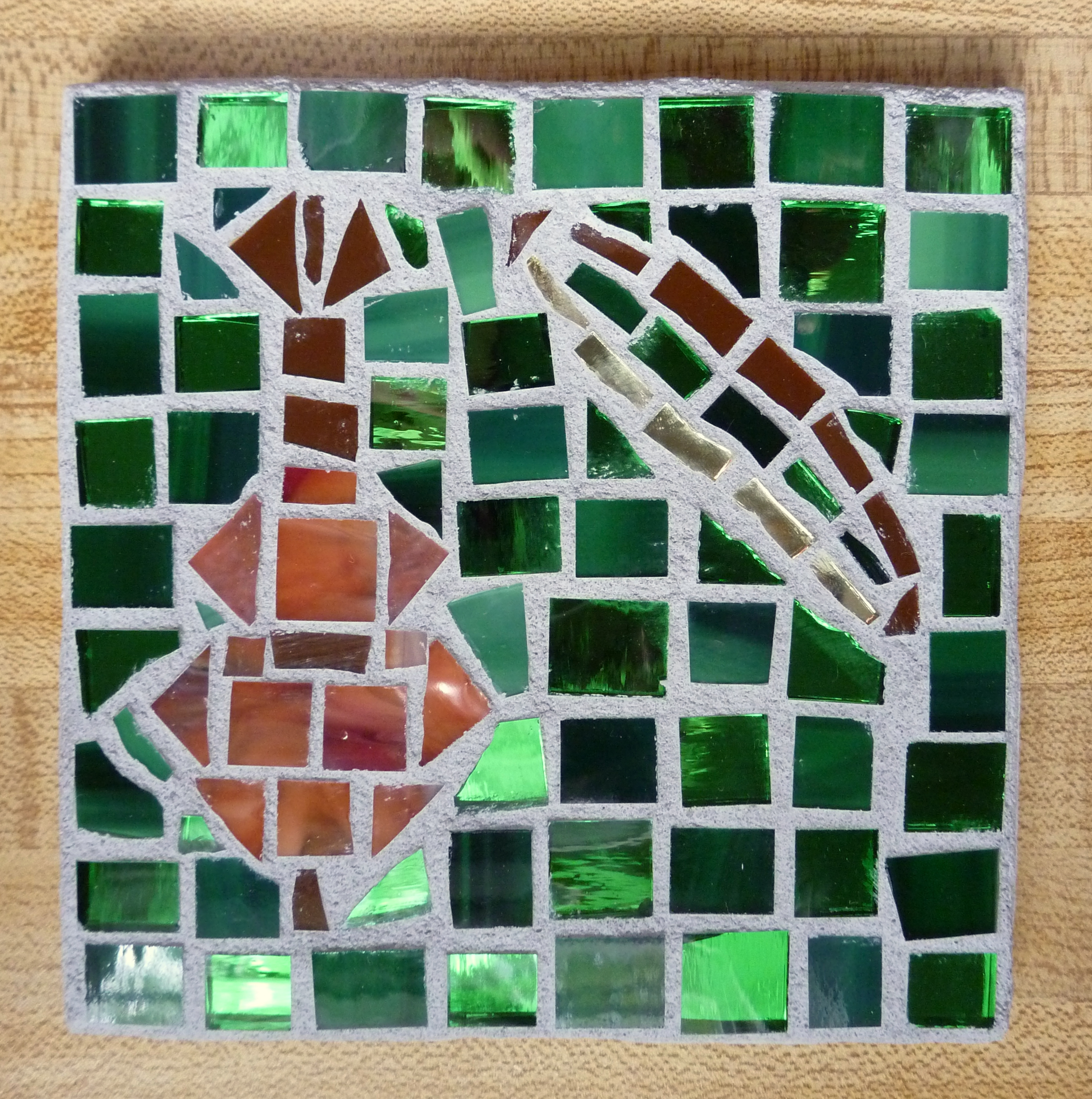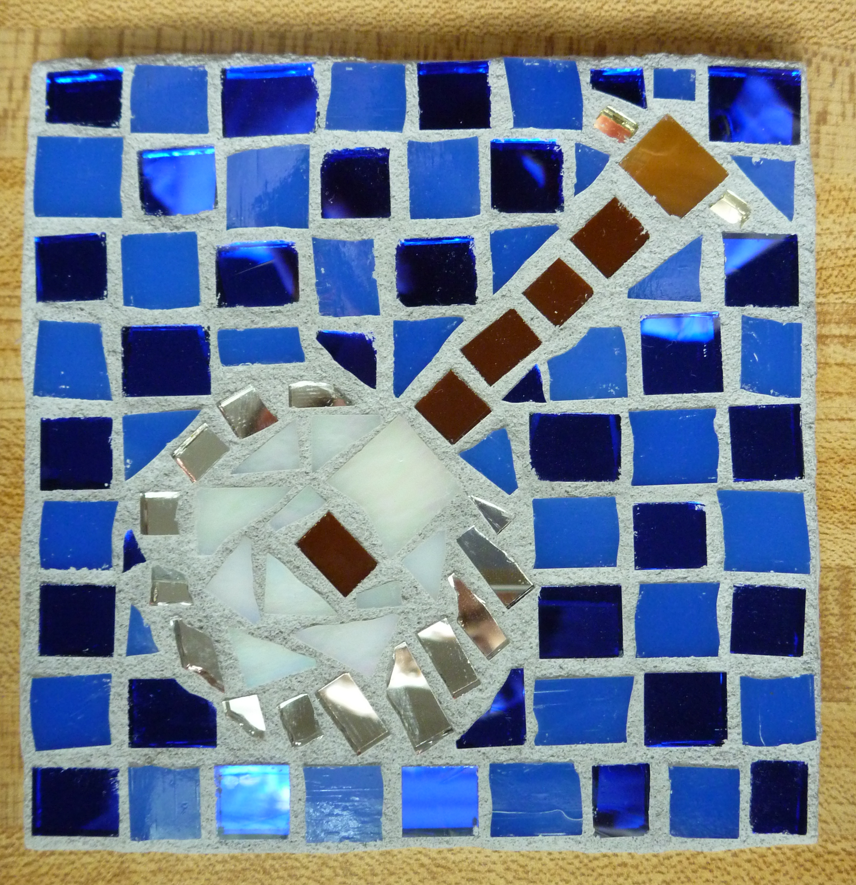 These coasters are the second and third mosaic pieces that I ever made and they remain dear to my heart. I came up with these images, undoubtedly inspired by my husband’s love of folk music, during a 3 hour mosaic workshop at Village Glass Works in Columbia, Missouri. They inspired my future creations, combining music and mosaics.